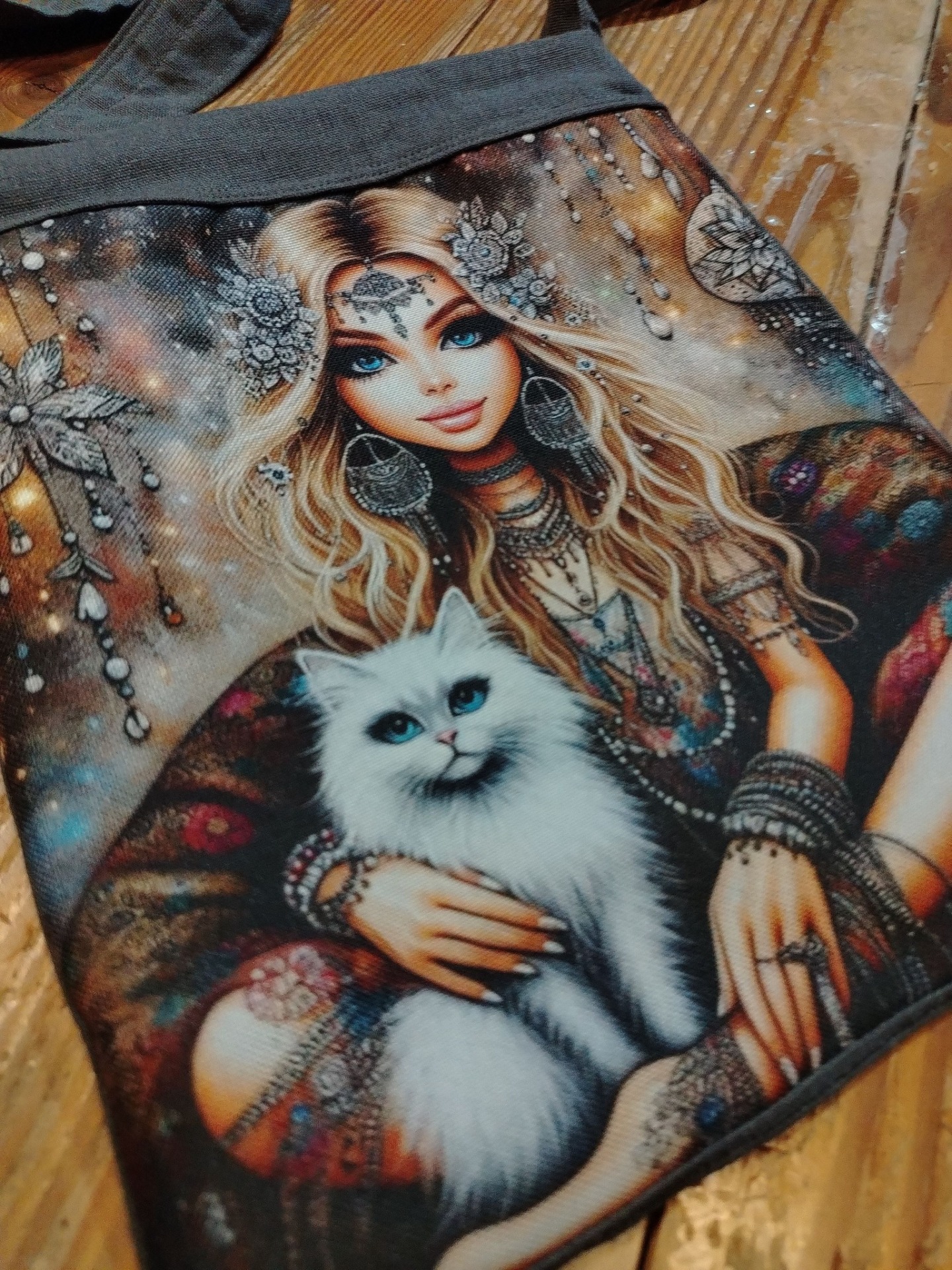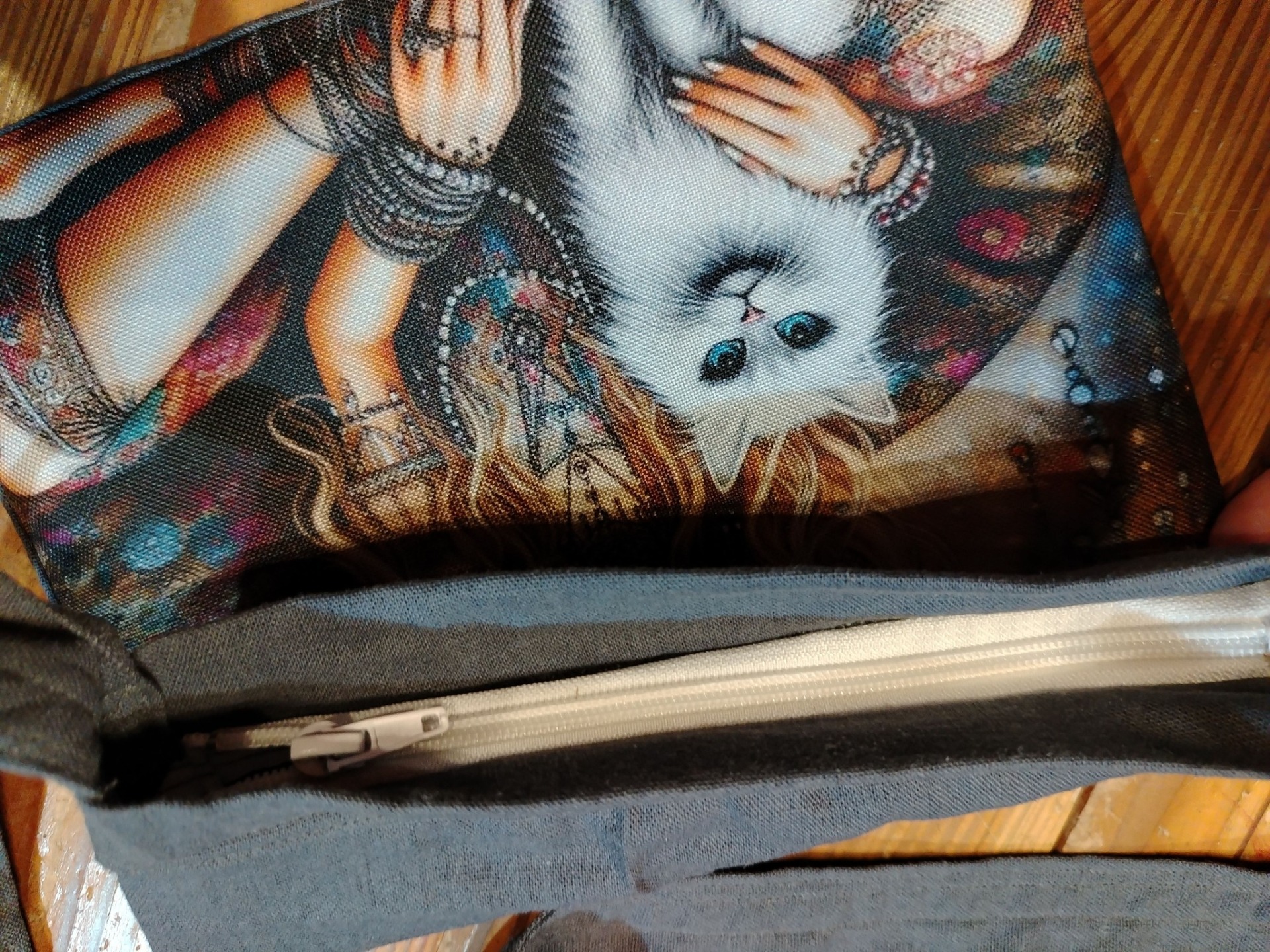 Ušitá z pevné látky, na přední straně panel z kočárkoviny.