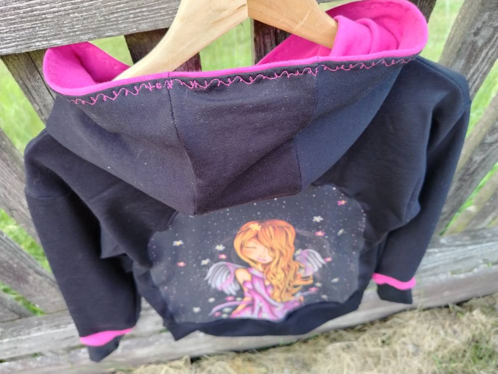 Andělská mikina pro dceru. Panel s andělem si vybrala sama. A já si užila práci s detaily. Hlavně pak míšení černé a růžové barvy.